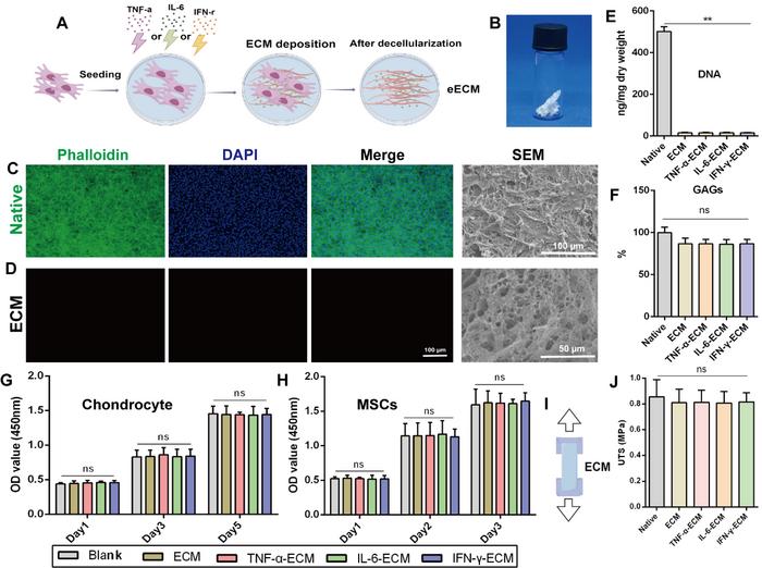 研究团队通过优化间充质基质细胞(MSCs)来源的细胞外基质(ECM),并利用细胞因子(如IL-6、TNF-α和IFN-γ)进行预处理,成功开发出一种具有生物活性的工程化细胞外基质(eECM)。通过免疫荧光和扫描电子显微镜观察,发现经过预处理的MSCs在去细胞化后,其细胞骨架和细胞核被完全去除,而糖胺聚糖(GAG)含量保持稳定,表明去细胞化过程成功且保留了关键的ECM成分(图1)。