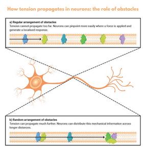 El modelado matemático, junto con los datos experimentales, reveló que cuando los obstáculos están alineados en un patrón regular, restringen la propagación a distancias más cortas. Según los investigadores, una propagación controlada y limitada de la tensión no es necesariamente una desventaja. Por el contrario, puede ayudar a las neuronas a localizar con precisión dónde se aplica una fuerza, distinguir entre diferentes estímulos y generar respuestas localizadas sin afectar a toda la célula. Esto, a su vez, podría mejorar la capacidad de la neurona para el procesamiento sensorial o producir respuestas motoras más adaptativas. Por otro lado, una disposición aleatoria de obstáculos permite que la tensión viaje mucho más lejos, lo que podría ayudar a las células a distribuir información mecánica a mayores distancias.