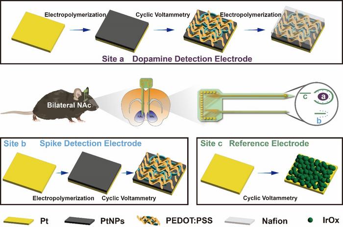 然而,现有的神经传感技术在实现电生理与神经化学信号的原位同步检测方面仍面临显著局限。尽管已有研究尝试将电化学功能集成于微电极阵列以实现同步采集,但现有集成方案仍存在两大技术瓶颈:其一,系统普遍依赖于外部植入的参比电极,其尺寸较大、植入创伤显著,且长期稳定性较差,严重影响器件的生物相容性与信号可靠性;其二,传统修饰方法多采用整体性涂层策略,易导致不同功能位点之间发生信号串扰,难以同时实现高灵敏度的神经化学检测与高保真度的电生理记录。这些根本性缺陷制约了在体神经功能耦合数据的质量与稳定性,也阻碍了对睡眠等复杂状态下神经环路机制的深入解析及相关干预策略的转化探索。
