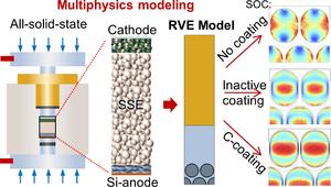 A computational framework integrates electrochemical lithium-ion intercalation dynamics with mechanical stress evolution in battery materials, addressing a critical gap in solid-state battery design. The specific aspect of coating material for silicon particles in anode layer is investigated, and the key parameters, including coating thickness and strength are systematically analyzed.