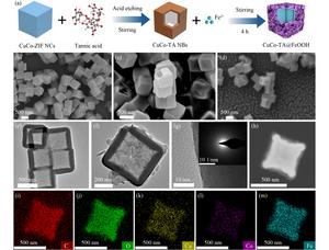 Shanghai Jiao Tong University Journal CenterTo mitigate the adverse effects of high concentrations of Cl− ions in seawater on electrolysis efficiency, it is essential to develop efficient and stable electrocatalysts. Based on this need, CuCo-ZIF NCs were used as a precursor to synthesize a CuCo-TA@FeOOH heterojunction composites, specifically designed for the oxygen evolution reaction (OER) in alkaline seawater, through a combination of acid etching and a self-growth method. The resulting material exhibits an OER overpotential of 234 mV at 10 mA/cm2 in alkaline freshwater and 256 mV at 10 mA/cm2 in seawater electrolyte. This performance is attributed to synergistic interactions at the heterojunction interfaces, which enhances the specific surface area, offers abundant active sites, and improves mass transfer efficiency, thereby increasing catalytic activity. Moreover, at a current density of 100 mA/cm2, it maintains stable performance for up to 300 h without deactivation. This remarkable stability and corrosion resistance stems from the synergistic effect at the CoOOH and FeOOH interface formed during reconstruction, which facilitates electron transfer, optimizes the electronic structure during the reaction process, and effectively suppresses the chlorine evolution reaction (CER). This study offers a valuable reference for the rational design of high-performance electrocatalysts for alkaline seawater oxidation.
