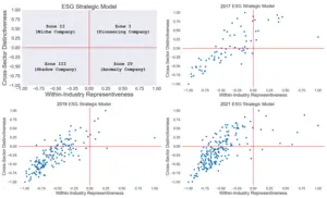 The environmental, social, and governance (ESG) report is globally recognized as a keystone in sustainable enterprise development. However, current literature has not concluded the development of topics and trends in ESG contexts in the twenty-first century. Therefore, we selected 1114 ESG reports from global firms in the technology industry to analyze the evolutionary trends of ESG topics by text mining. We discovered the homogenization effect toward low environmental, medium governance, and high social features in the evolution. We also designed a strategic framework to look closer into the dynamic changes of firms’ within-industry representiveness and cross-sector distinctiveness, which demonstrates corporate social responsibility and sustainability. We found that companies are gradually converging toward the third quadrant, which indicates that firms contribute less to industrial outstanding and professional distinctiveness in ESG reporting. Firms choose to imitate ESG reports from each other to mitigate uncertainty and enhance behavioral legitimacy.